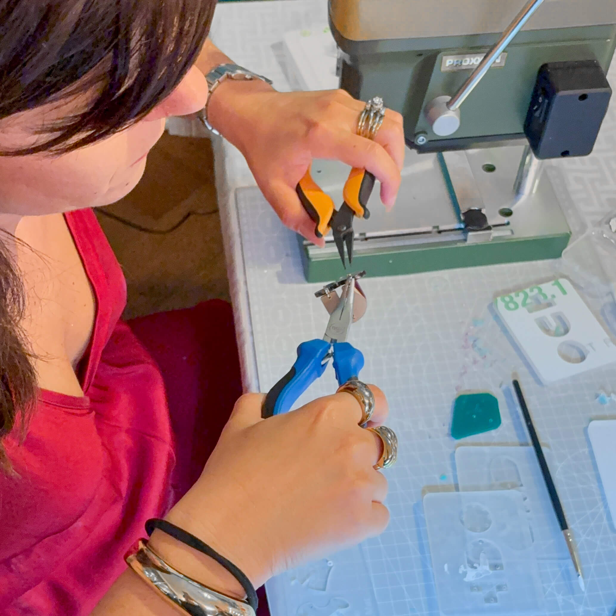 Mini workshop creativo: porto i materiali, facciamo un po’ di teoria del colore per capire gli abbinamenti e poi ci divertiamo davvero. Scegliamo forme e colori, assembliamo insieme il tuo paio di orecchini e a fine serata lo porti a casa, pronto. Felice e soddisfatta.